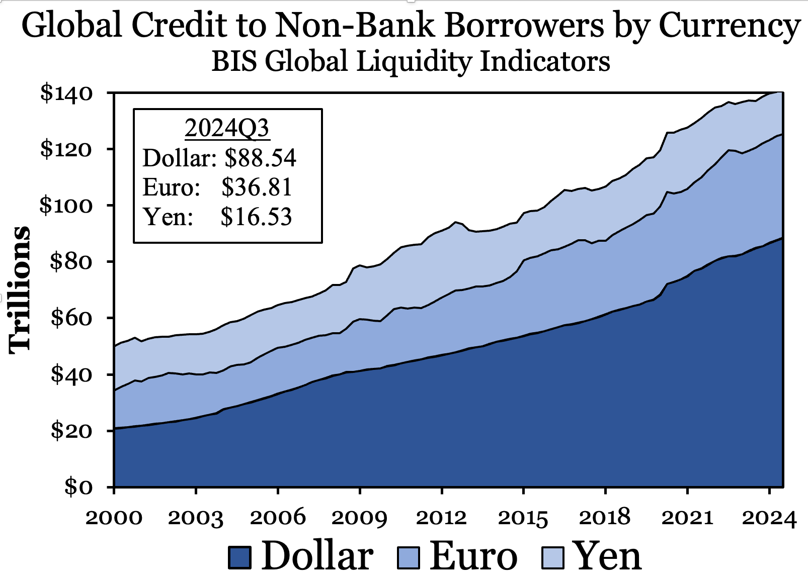 What I want to illustrate here is the dollar’s dominance in global credit markets, using BIS data on global liquidity. The data show that total U.S. dollar credit to non-bank borrowers—both inside and outside the United States—vastly exceeds credit denominated in other major currencies like the euro and yen, as seen in the figure below. Not only does global dollar credit overshadow its rivals in scale, but it continues to grow faster than they do, even as the U.S. economy’s share of global GDP declines. It’s a vivid illustration of just how deeply entrenched the dollar’s position is and how path dependencies in global finance tend to reinforce themselves over time.