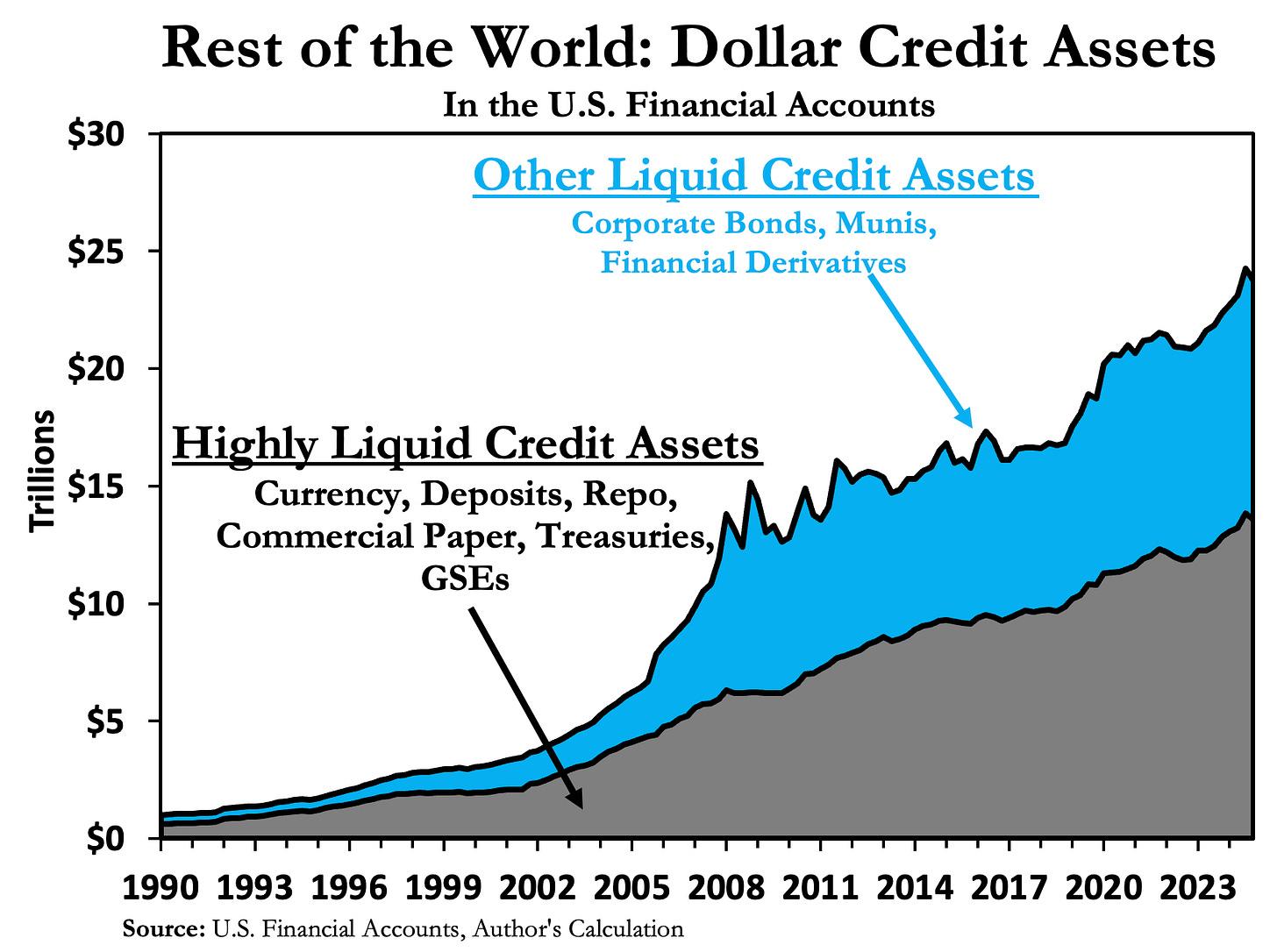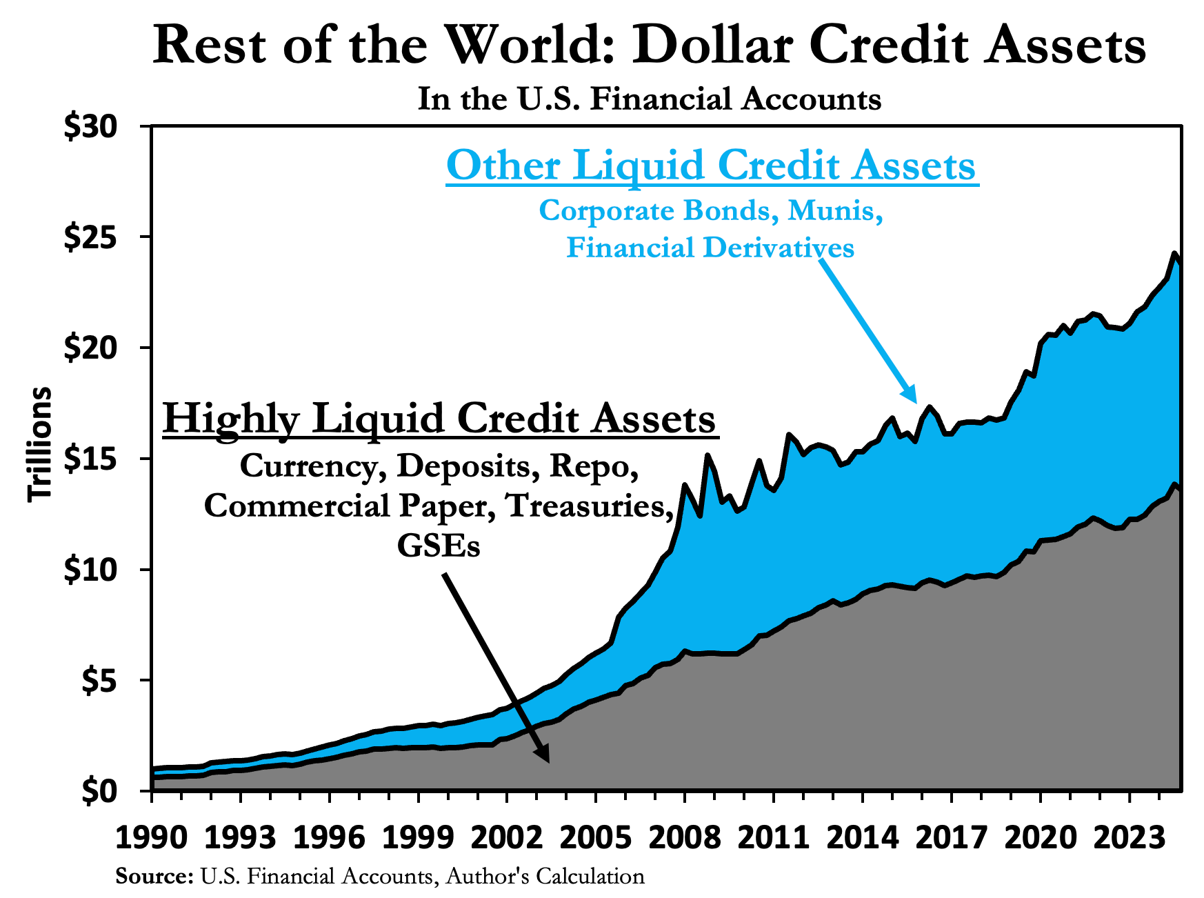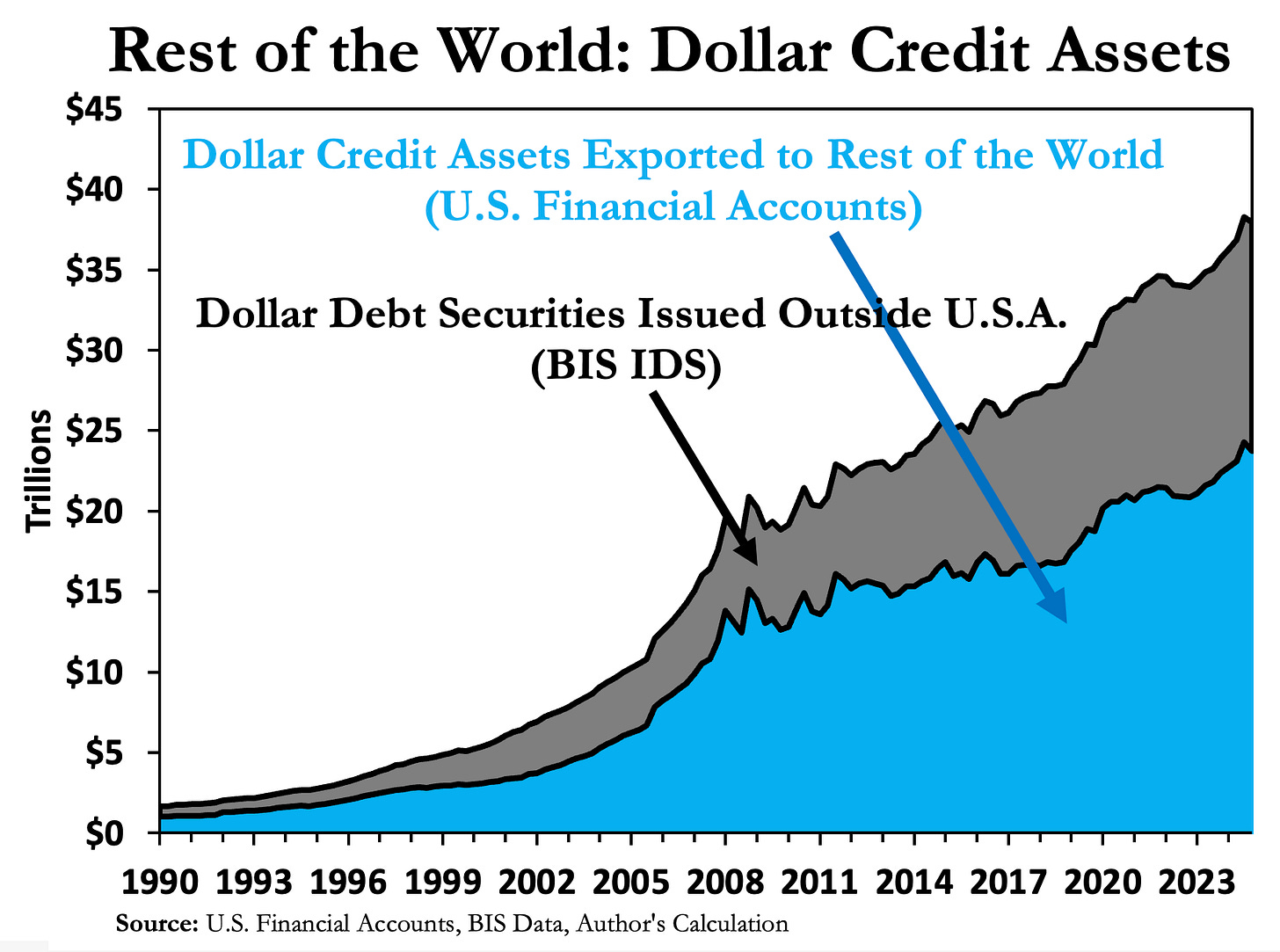 But the story gets even more compelling when we shift from issuance to ownership. By combining U.S. Financial Accounts data on credit assets with BIS figures on international debt securities we see that a large and growing share of these dollar-denominated credit assets is held outside the United States. As the chart below reveals, foreign holdings of liquid U.S. dollar credit assets now total nearly $38 trillion, spanning everything from Treasuries and deposits to corporate bonds and financial derivatives. These holdings represent the backbone of global portfolio allocations, collateral chains, and payment systems.