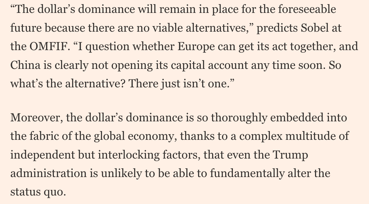 While there is some truth and intuitive appeal to these arguments—especially amid rising geopolitical tensions—they ultimately miss the mark. They underestimate the extraordinary scale, depth, and embeddedness of the dollar-based system, and gloss over the immense hurdles any rival currency would face in trying to replicate it. The network effects and balance sheet capacity required to meaningfully challenge the dollar are so vast that such a shift is not just unlikely, it is borderline implausible in any foreseeable timeframe. It would take far more than a chaotic and ill-conceived trade war to dethrone the dollar.
