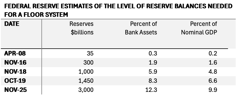 As Bill Nelson noted, the Fed now believes it needs roughly $3 trillion in reserve balances to operate its floor system, implying a minimum securities portfolio of about $6½ trillion once currency in circulation and the Treasury General Account are taken into account. What stands out is not just the size of that number, but its direction. Over time, the Fed’s estimate of what constitutes “ample” reserves has moved in only one direction: up. The table below, drawn from Nelson’s analysis, reveals this pattern: