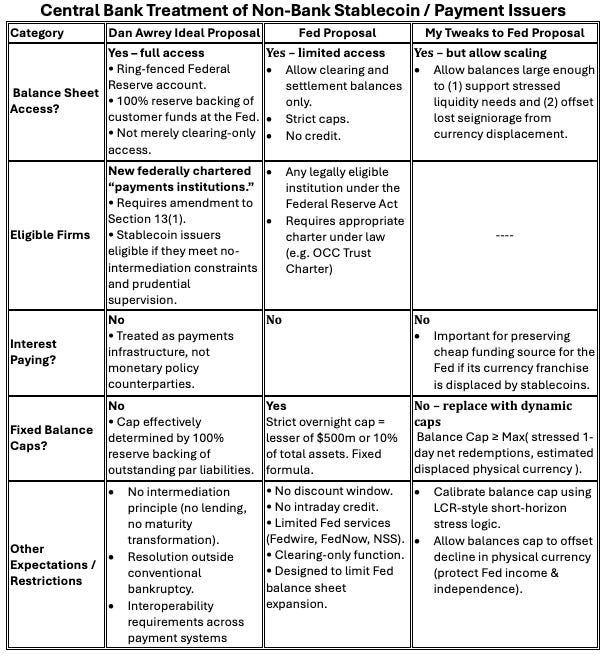 Taken together, these recommendations place my approach somewhere between the Fed’s current proposal and Awrey’s ideal model. As the table below illustrates, Awrey’s framework calls for full Master Account access, strict structural constraints, and bespoke resolution — a clean narrow-payments tier anchored at the Fed. The Fed’s SPPA, by contrast, offers limited settlement access with tight caps and no statutory change. My proposal accepts the SPPA’s constrained structure but adjusts it to better reflect monetary realities: preserve seigniorage, allow balances to scale with payment demand, and ensure liquidity during stress.