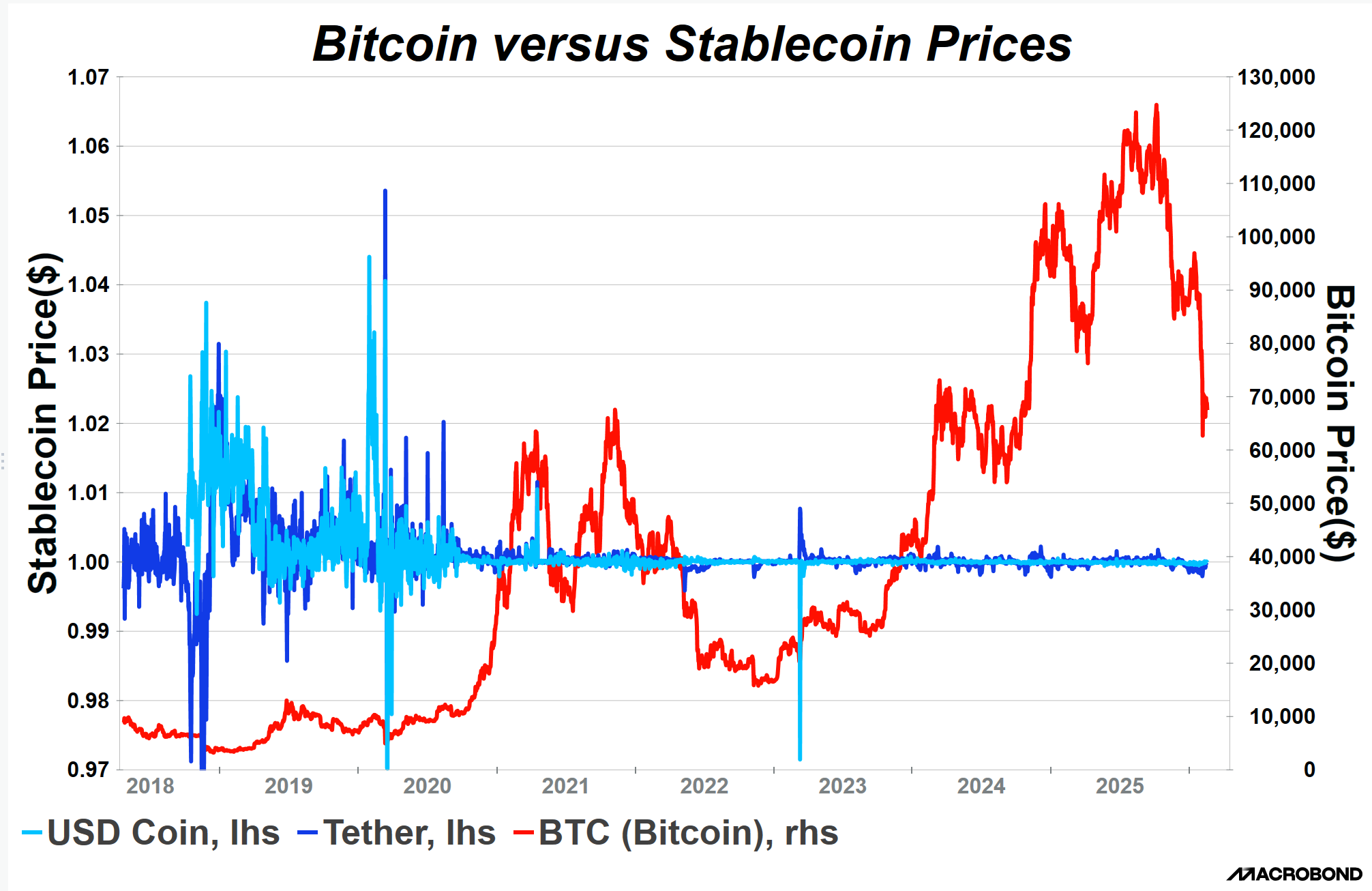 Of course, stablecoins are designed to be stable. But they have not always lived up to that billing. As the chart reveals, there have been periods when stablecoins fell below par, reminding us that the $1 peg is not absolute. Even so, the fact that they have recently held their ground while other risk assets have sold off is notable. Stablecoins, at least for now, have behaved like money.