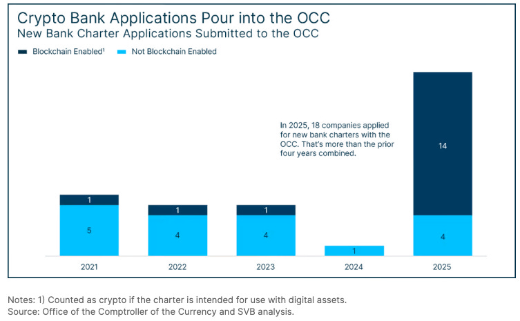 And, as it turns out, this exactly what we have been seeing recently. There was a large increase in OCC trust charter application by blockchain-related fintech firms in 2025 after the passage of the GENIUS Act. This can be seen in the figure below (source). There is likely to many more applications in 2026.