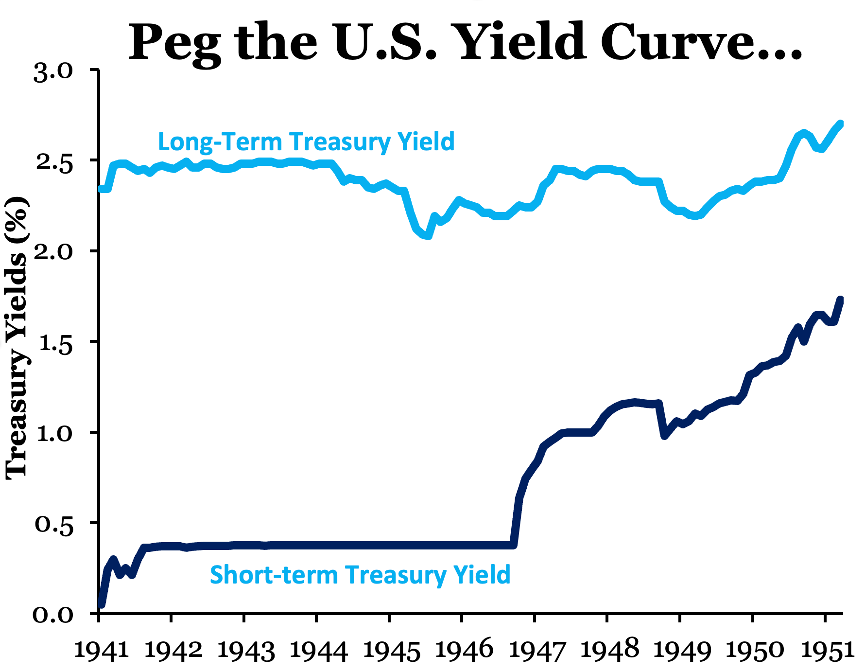 Fiscal dominance isn’t just a theoretical concern for the Fed , it is part of its history. From 1942 to 1951, the Fed operated under an explicit agreement with the Treasury to cap interest rates across the yield curve to support wartime financing. Short-term rates were held at ⅜ percent, and long-term rates were pegged at 2.5 percent. The interest rate caps can be seen in the figure below: