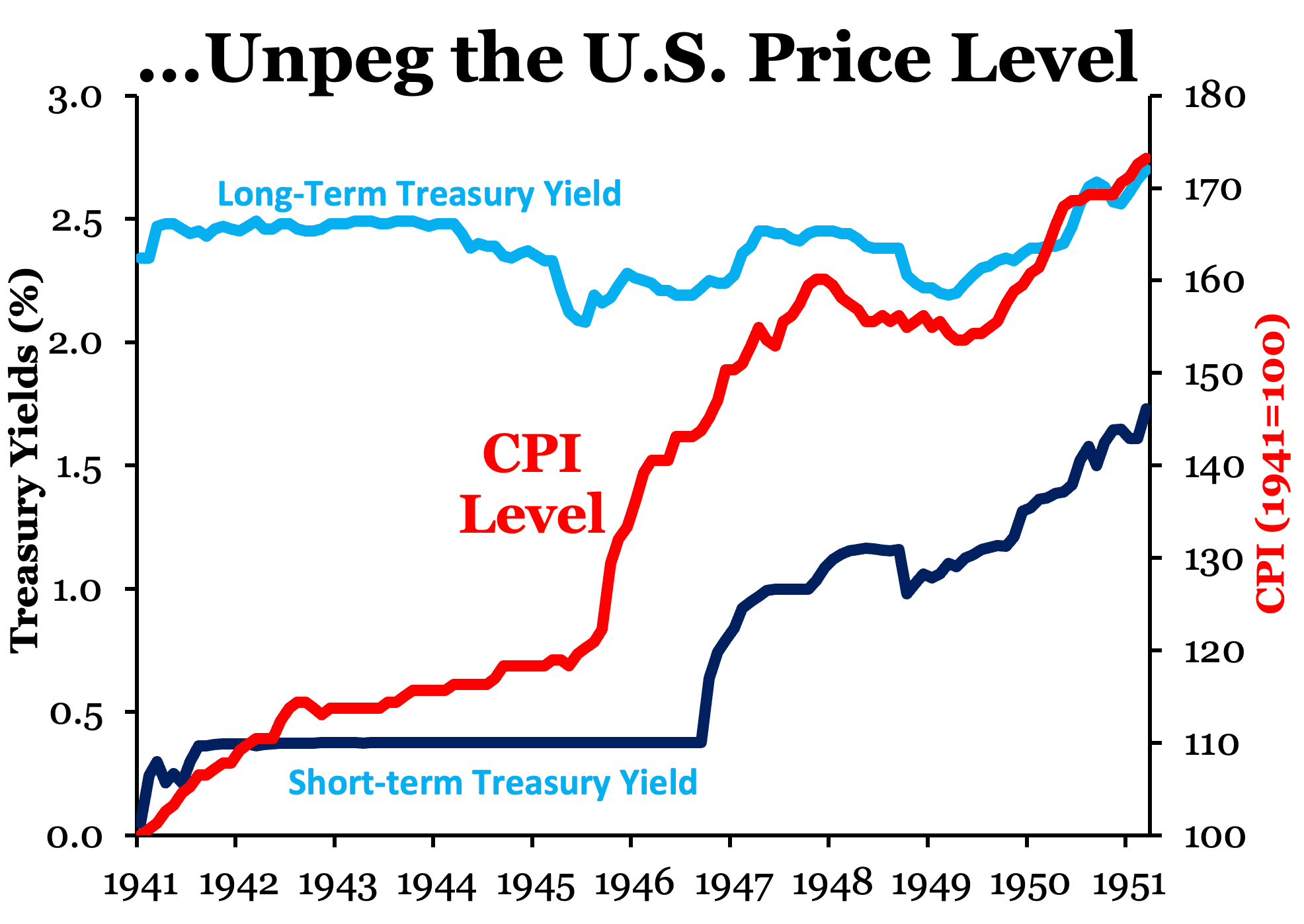 To maintain those caps, the Fed stood ready to buy Treasury securities in whatever quantity was needed, effectively monetizing fiscal policy. The Fed, in short, subordinated its inflation objective to the government's funding needs and, as a result, the price level eventually surged as can be seen below: