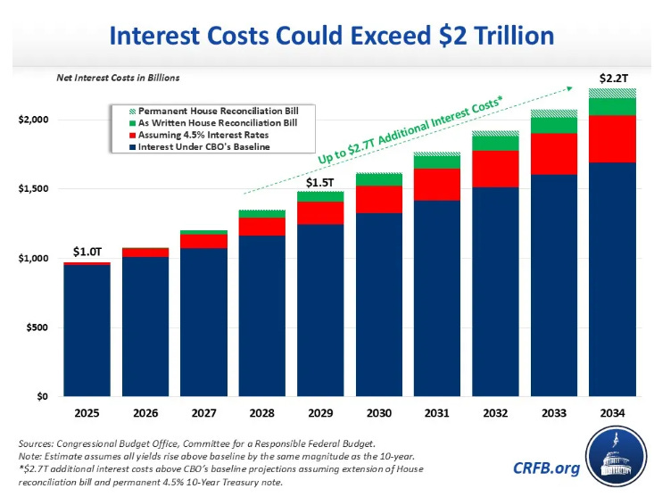 This discussion should raise questions about the current elevated financing cost of U.S. debt. As noted above, the CBO expects net interest payments to run near 4 percent of GDP a year over the next decade. The Committee for a Responsible Federal Budget (CRFB) says the current budget proposals could push it past 5 percent by 2034. Under the CRFB’s scenario, interest payments would total $15.7 trillion between FY 2025 and 2034. How would it be financed?