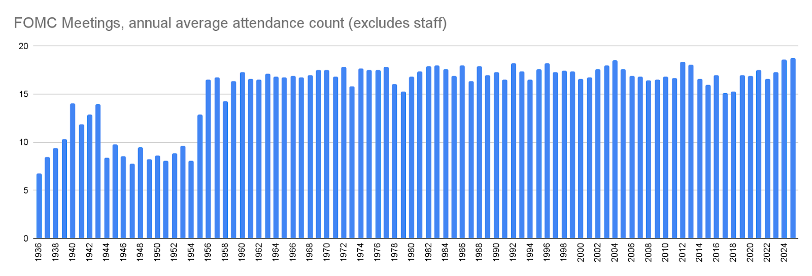 This dataset is based on attendance records in the minutes of every single FOMC meeting from March 18, 1936, to December 10, 2025. The full dataset is available in this spreadsheet.