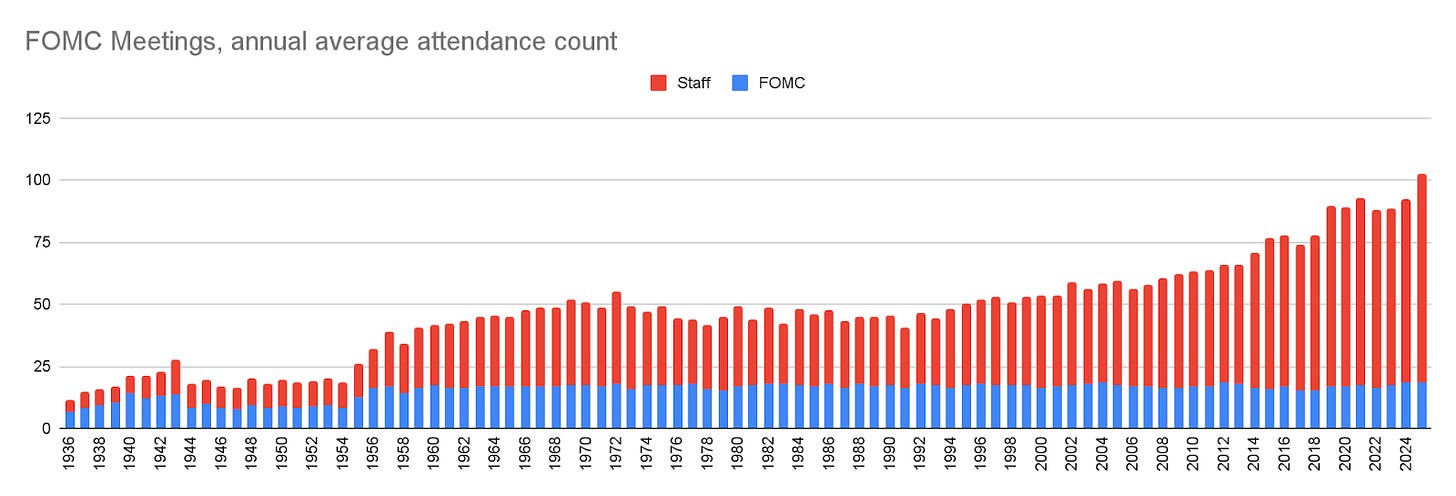 And now I’ll shift your attention from the “when” of the meetings to the “who”. This next chart might be my favorite one. It clearly shows the massive expansion of staff that is welcomed into the committee meetings, from a small handful for the first few years to approximately the same number as the FOMC through the 1950s. After that, the number of staff to FOMC double until around the turn of the century, when staff participation begins to grow, and grow, and grow. Last year’s average total meeting attendance surpassed 100 and the record attendance at an FOMC meeting was June 16-17, 2025 with 96 staffers.