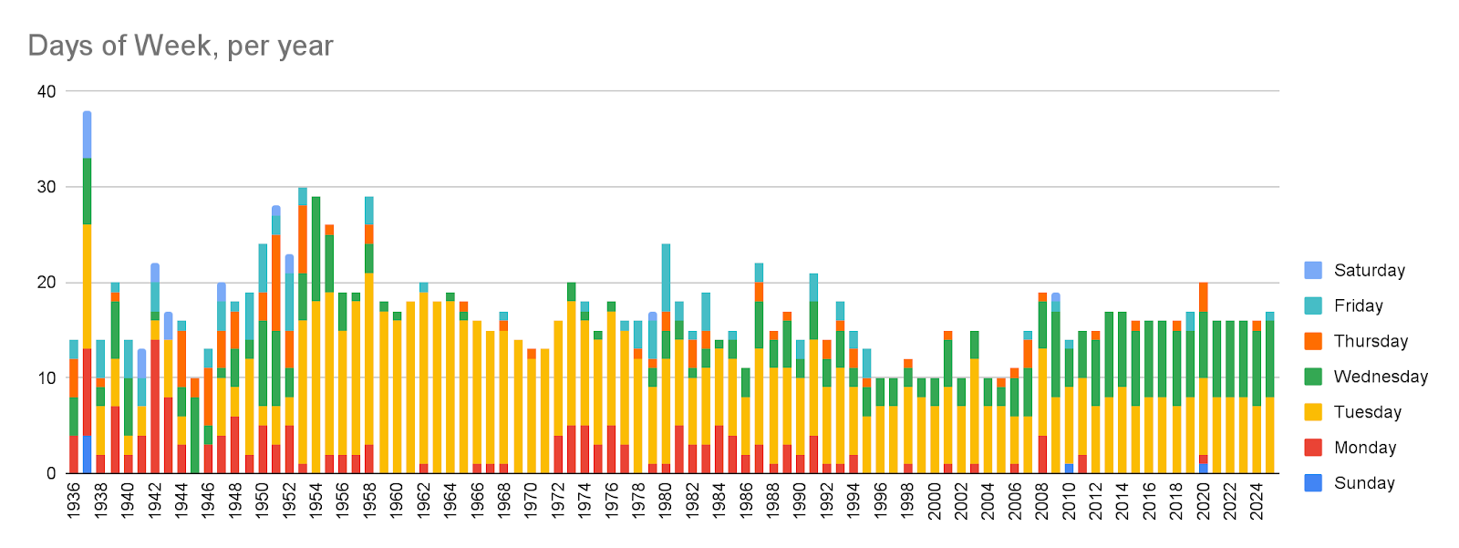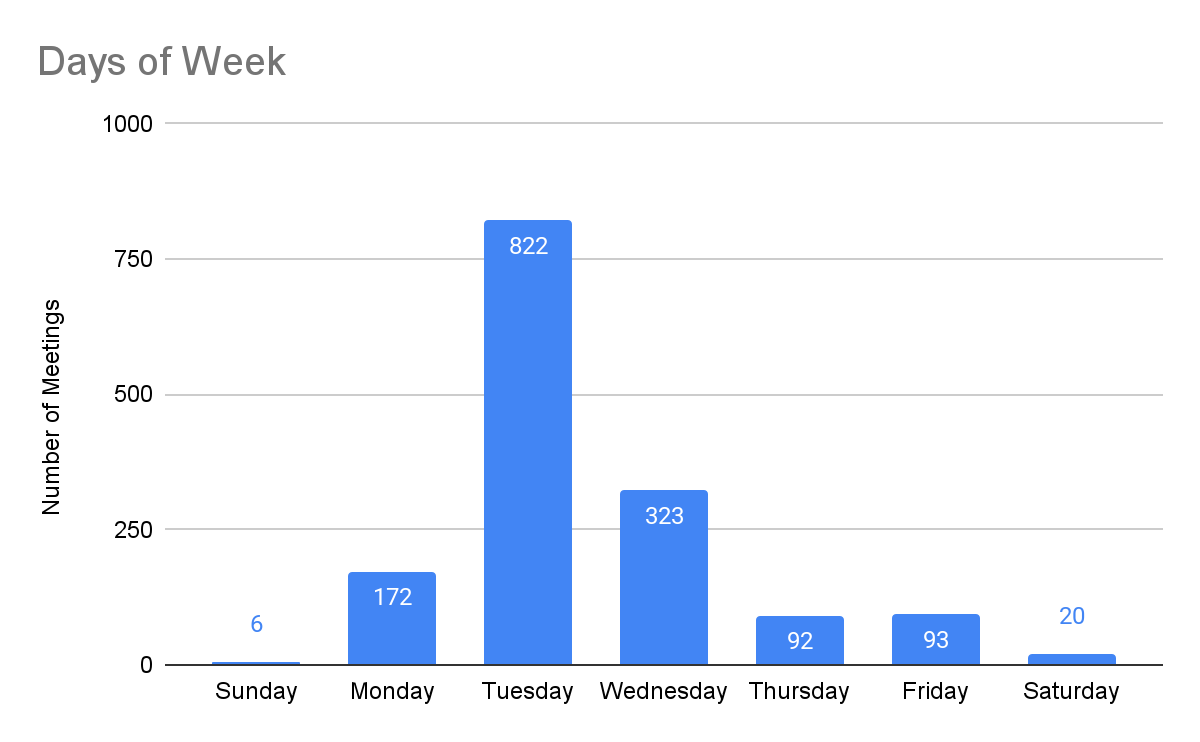 Moving on to the next chart, we see that more meetings have been held on Tuesdays than every other day of the week combined.