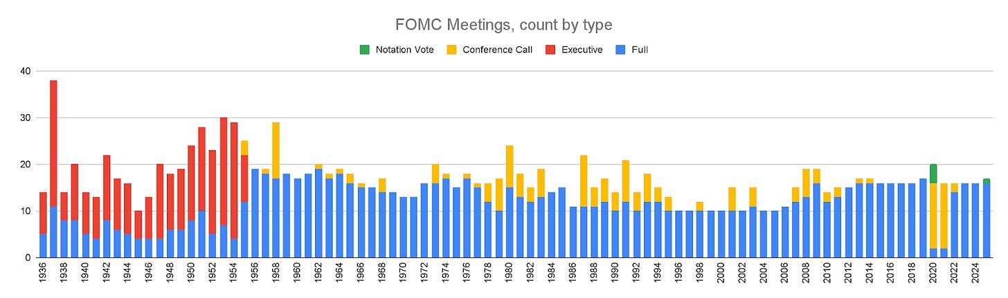 Teleconferences began in the mid-1950s and were obviously the only way the committee met from February 2020 to November 2021. And for purposes of my dataset, I count a meeting as one day, hence the modern base count is 16, for the eight, two-day meetings, held approximately every six weeks these days.