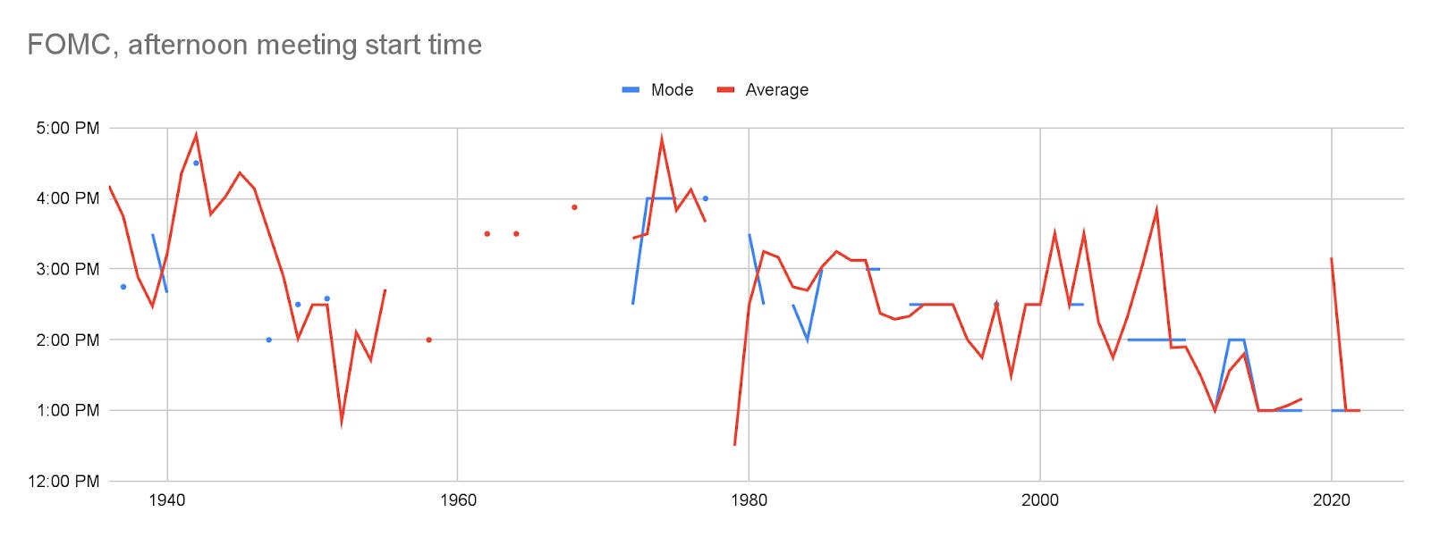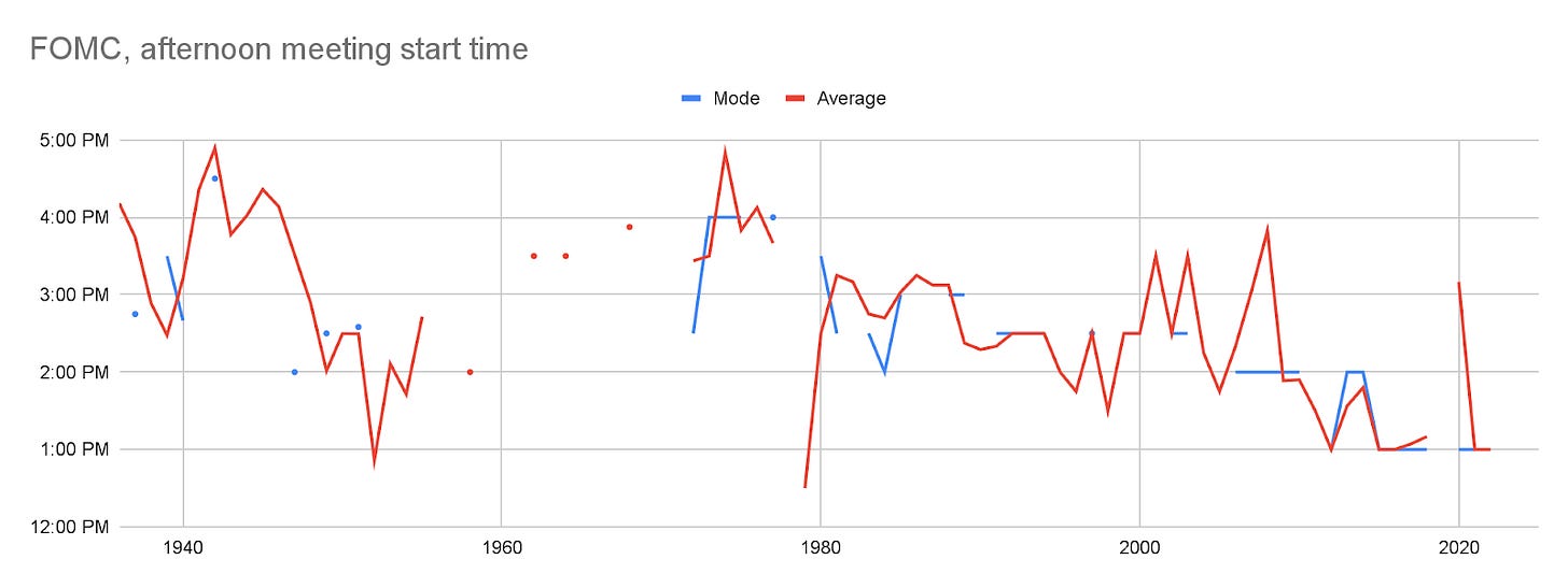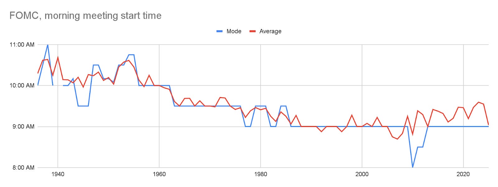 One can’t have read Lords of Finance, or any Fed history book for that matter, and not have pondered the differences from today in what it meant “to work”. The head of the Bank of England or Federal Reserve Bank of New York taking off for months would be quite concerning today, but happened multiple times in the interwar period. And although I didn’t track sick-leave specifically, and Strong died before the FOMC was formally constituted, this example of meeting start-time left me with similar vibes. Average and modal start times for morning meetings (often the second day of meetings), shifted a full hour and a half from 10:30am to 9am.