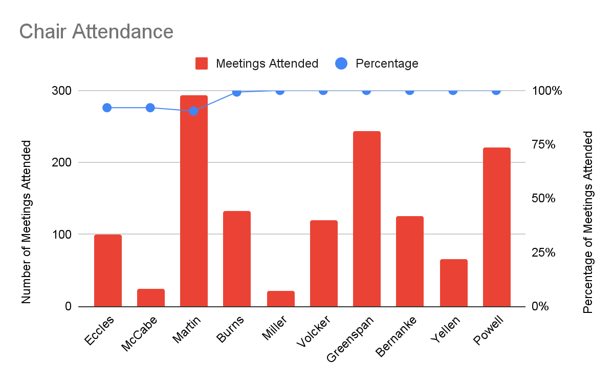 But first, let’s compare the Chairs. Honestly, it’s impressive that a Fed Chair hasn’t missed a single FOMC meeting since Burns in the 1970s.